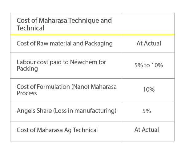 Maharasa Ag Technical is selected from FM1.0, FB1.0, PE1.0, and Bio1.0 based on the active ingredients in the product. The cost of the Maharasa Ag Technical is determined by the dilution ratio or the required dosage per hectare/acre and is added to the final formulation.